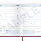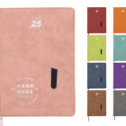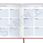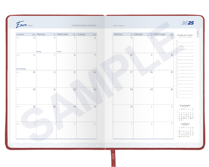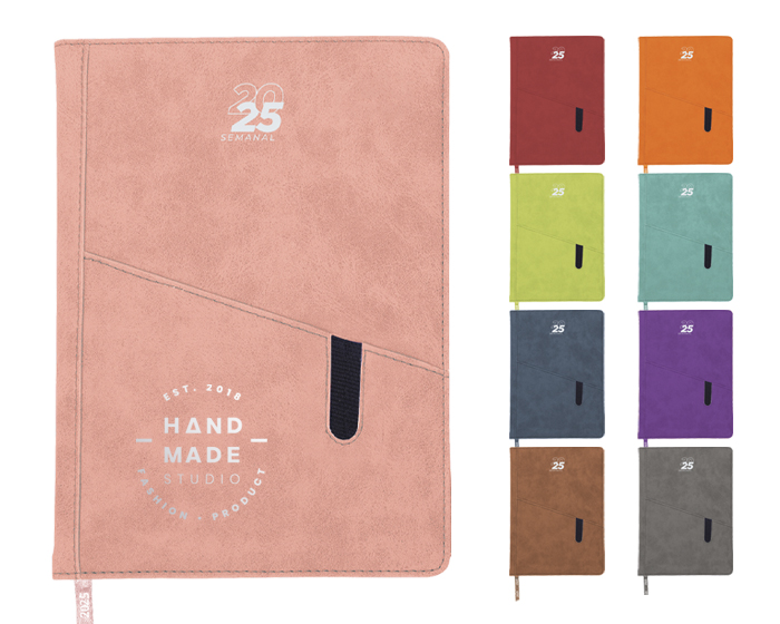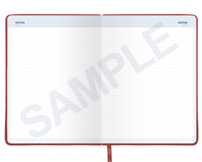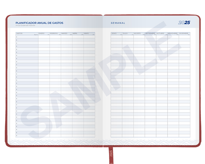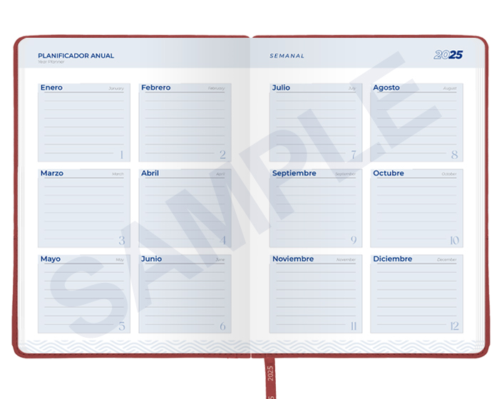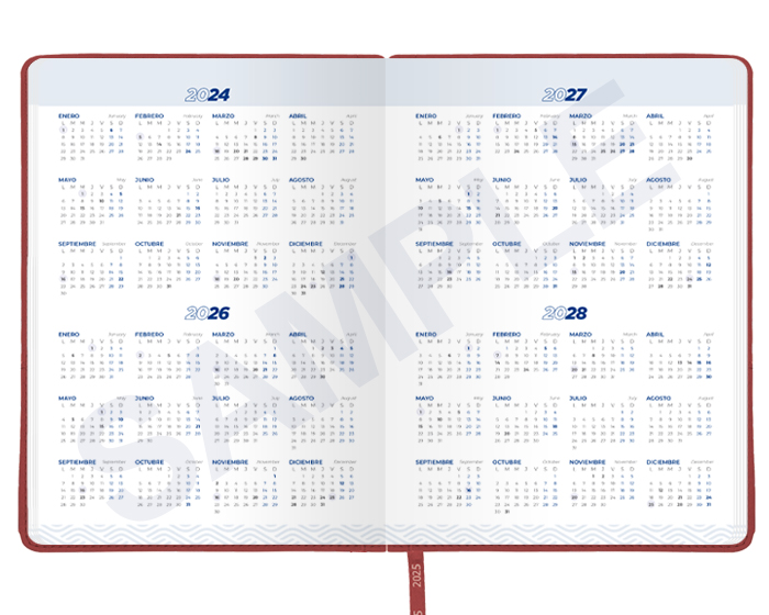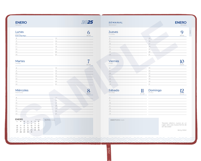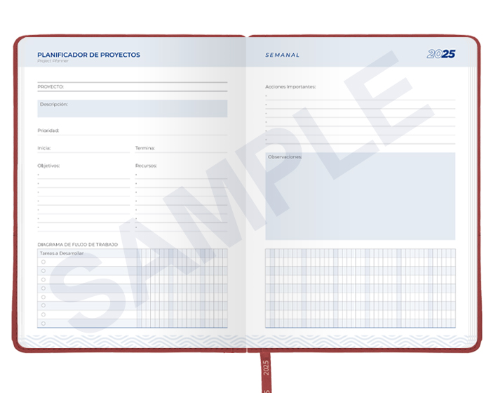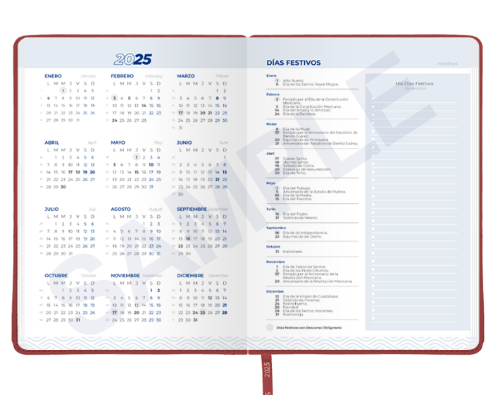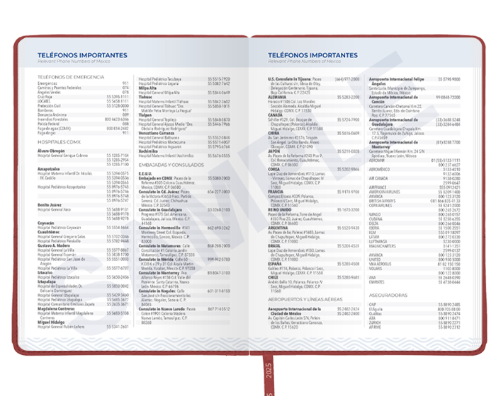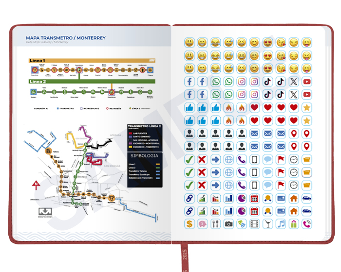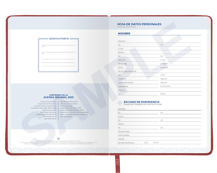 Agenda semanal de 98 hojas (196 páginas). Incluye: cuadro de dedicatoria, hoja de datos personales, calendario 2024 y días festivos importantes, calendarios 2023 a 2027, teléfonos importantes, planificador de gastos, planificador de proyectos (5), planificador anual, agenda semanal, planificadores mensuales (12), directorio de contactos, hojas para notas, Mapas de transporte: Metro y Metrobús de CDMX, Macrobús Guadalajara, Trans-metro Monterrey, hoja de stickers y separador de listón con el año.