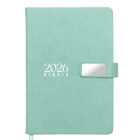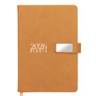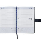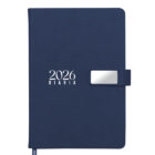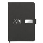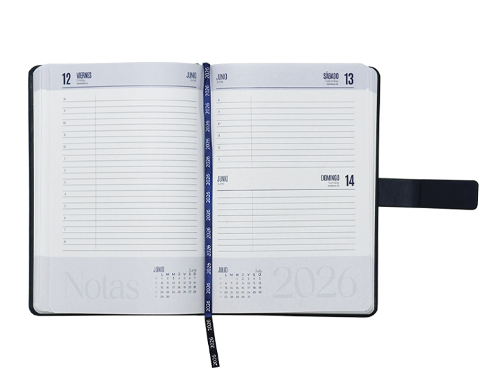 Agenda diaria de pasta rígida con cintillo magnético de PU con placa metálica y logotipo en color plata. Cuenta con 170 hojas (340 páginas), Incluye: cuadro de dedicatoria, hoja de datos personales, calendario 2026 y días festivos, calendarios 2025 a 2029, planificador anual, planificadores mensuales (12), agenda diaria 365 días, directorio de contactos y teléfonos de interés. Cuenta con resorte sujetador para bolígrafo y listón separador de color, impreso con el año 2026. Presentación: caja de regalo a color.
