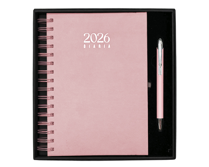 Agenda diaria de pasta rígida de PU con arillo y bolígrafo de aluminio a color. Cuenta con 177 hojas (352 páginas), Incluye: cuadro de dedicatoria, hoja de datos personales, calendario 2026 y días festivos, calendarios 2025 a 2029, teléfonos de interés, planificador anual, planificadores mensuales (12), agenda diaria 365 días y directorio de contactos. Incluye: bolígrafo de aluminio en color de la agenda con detalles en cromo. Presentación: Caja en color negro.