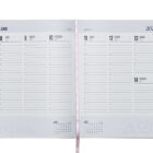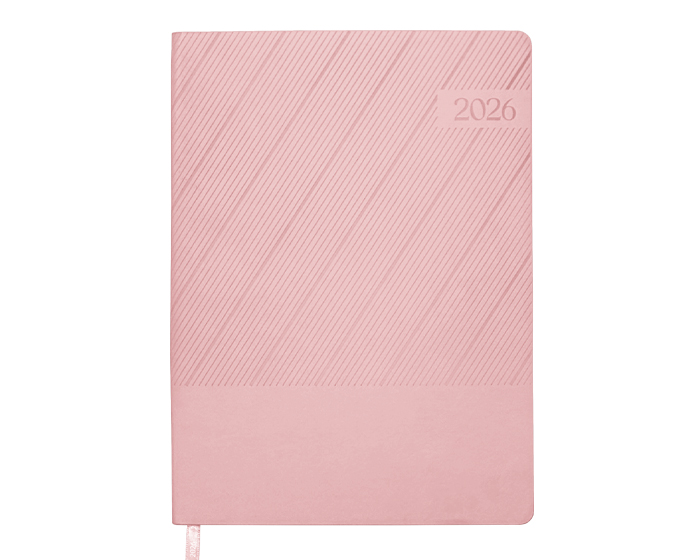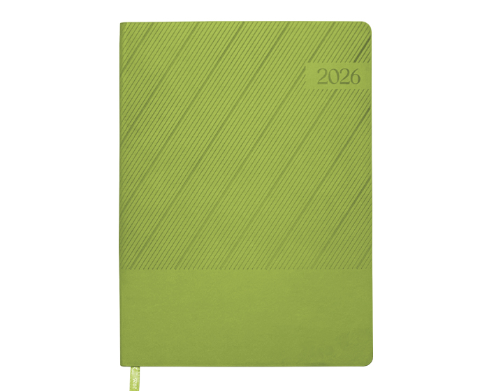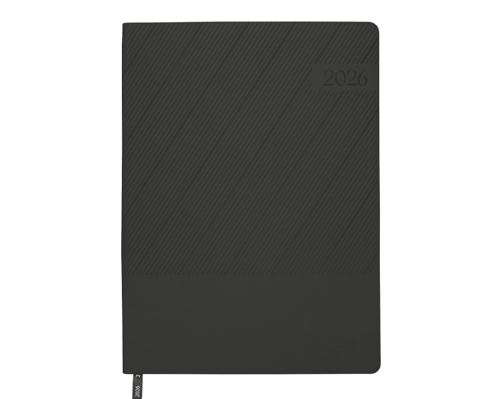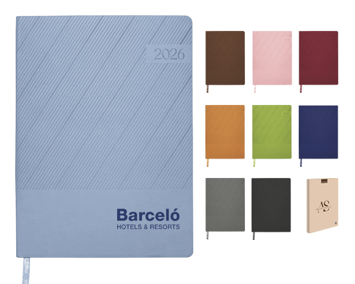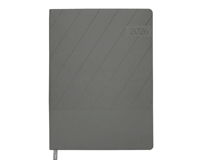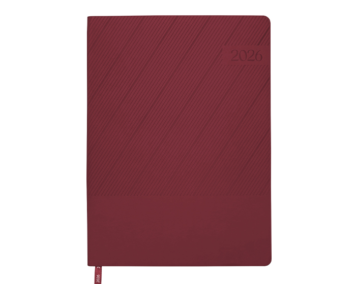 Agenda semanal de pasta semi flexible de PU, con textura de líneas diagonales en la parte superior y lisa en la parte inferior. Cuenta con 98 hojas (196 páginas). Contiene: cuadro de dedicatoria, hoja de datos personales, calendario 2026 y días festivos, calendarios 2025 a 2029, planificador anual de gastos, planificador de proyectos (5), planificador anual, planificadores mensuales (12), agenda semanal, directorio de contactos, teléfonos de interés, hojas para notas, Mapa Red Metro CDMX, Mapa Red Metrobús CDMX, Mapa Macrobús Guadalajara, Jalisco; Mapa Transmetro Monterrey, Nvo. León, Hoja de Stickers. Incluye: Listón separador de color, impreso con el año 2026. Presentación: caja de regalo a color.