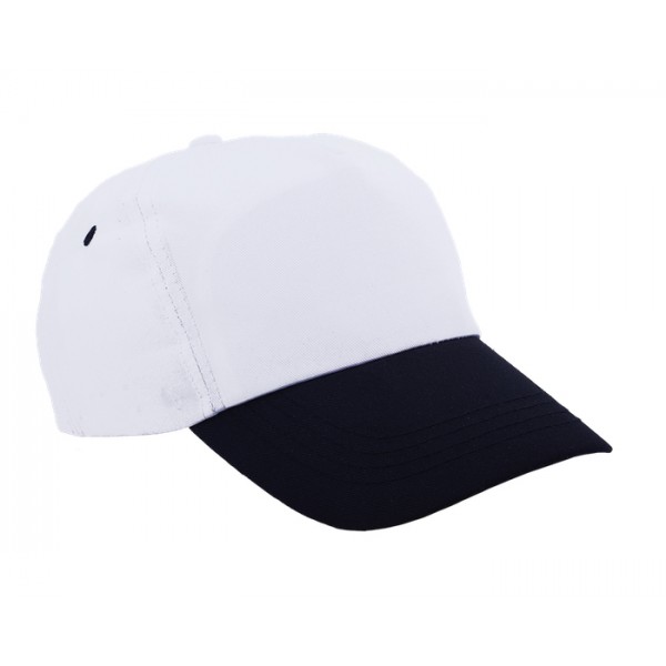 Gorra blanca de poliéster de 5 gajos con visera de color y broche ajustable de velcro. Cuenta con ojillos bordados en color.
