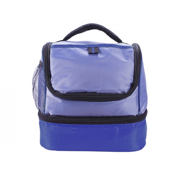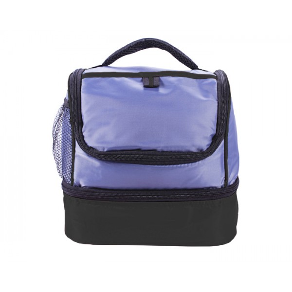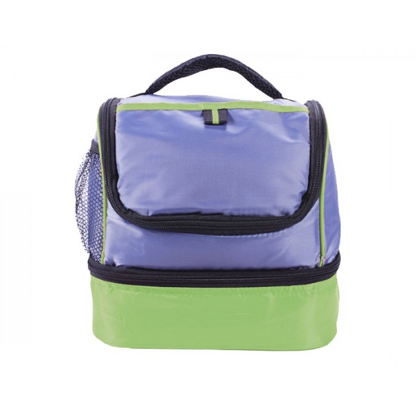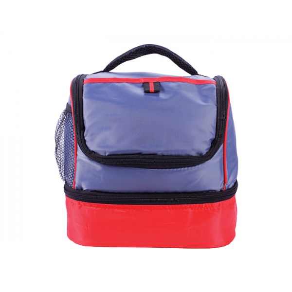 Lonchera térmica con dos compartimentos, bolsa lateral de malla y asa para transportar.