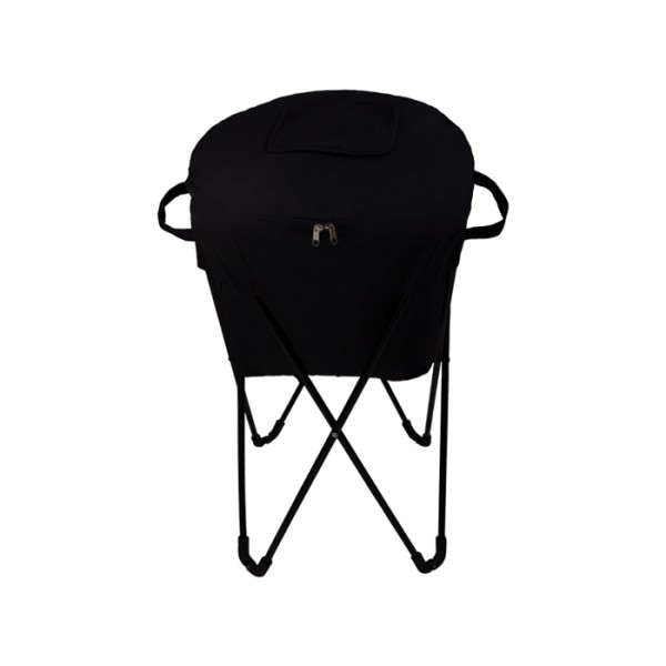 Hielera con base de metal plegable, tapa de velcro con compartimento, asas laterales y pivote para extracción de líquidos. Incluye estuche para guardar.