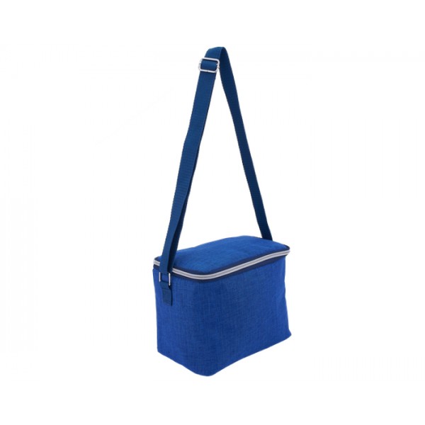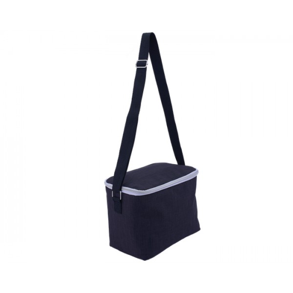 Lonchera rectangular con interior térmico plastificado antiescurrimientos. Cuenta con cierre y asa ajustable de poliéster. Ideal para guardar alimentos o bebidas.