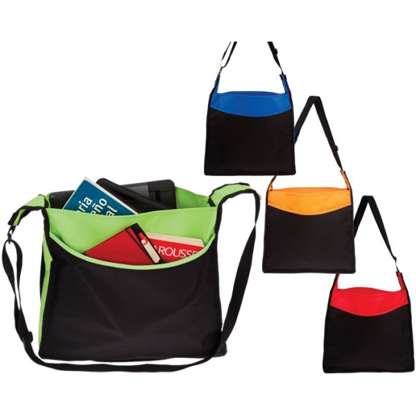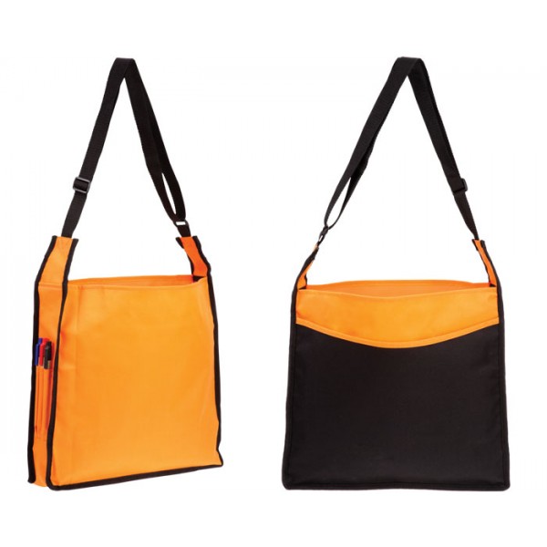 Bolsa tipo morral con interior plastificado, tirante ajustable, compartimento exterior y portalápices lateral.