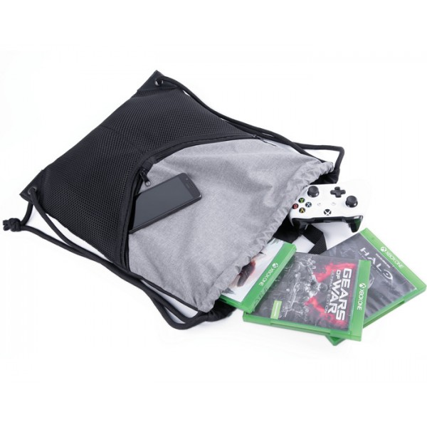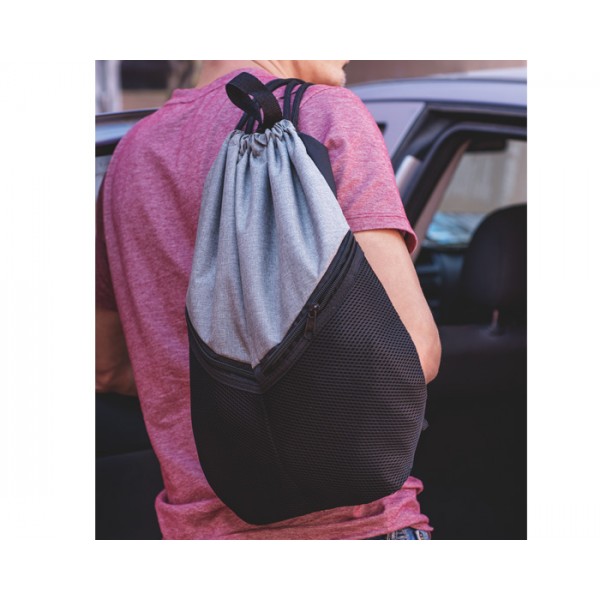 Morral con jareta con dos compartimentos exteriores con cierre.