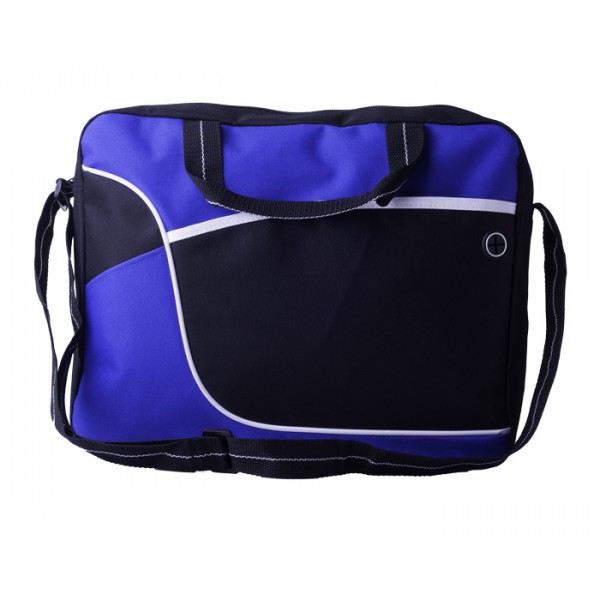 Bolsa tipo portafolio, en poliéster, asas y correa ajustable, cuenta con bolsillo externo con broche de velcro y salida para audífonos, en dos tonos de tela combinables.