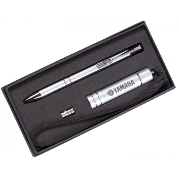 Juego de bolígrafo metálico y lámpara de aluminio, con luz LED, correa, botón de encendido. Baterías incluidas (4 pilas). Incluye caja color negro. Medidas de la lámpara 7.1 x 1.8 cm. Medidas de la caja 7.8 x 16.3 x 2.3 cm