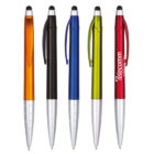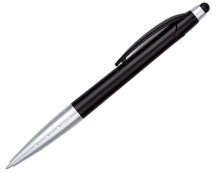 Bolígrafo de plástico con apariencia metálica, parte inferior diseñada en color plata que lo hace lucir con gran estilo al contar con pequeñas hendiduras en forma oval para una mejor sujeción, touch en color negro. Mecanismo retráctil