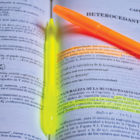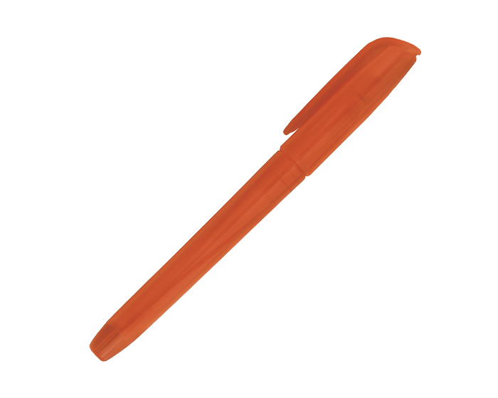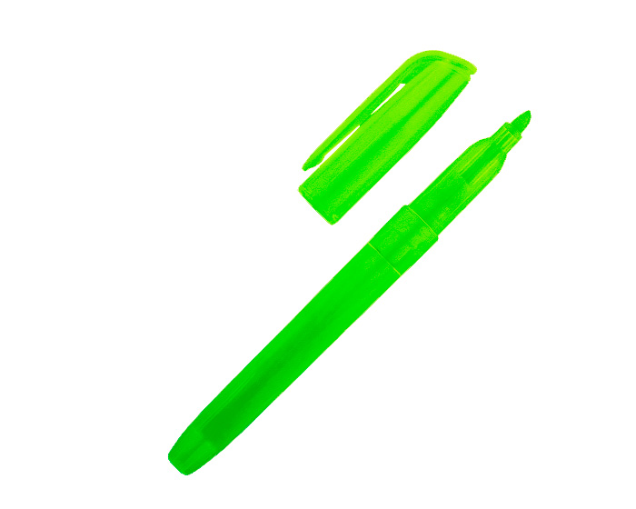 Marcador de plástico fosforescente de práctico diseño, con tapa y cuerpo que indican el color de la tinta.