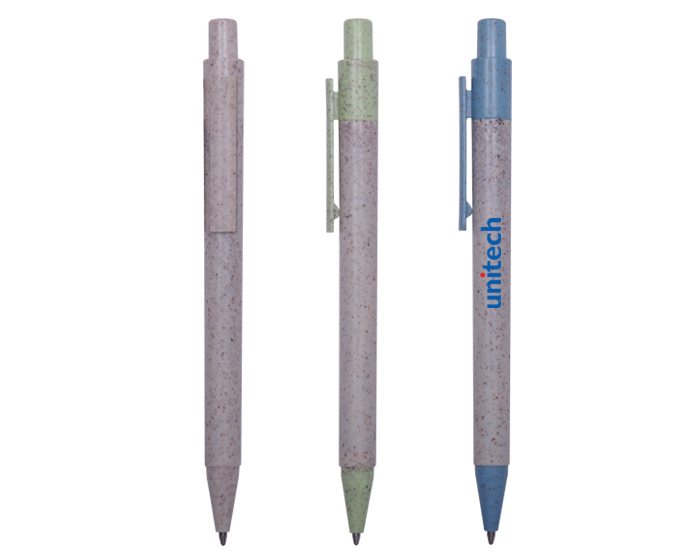 Bolígrafo ecológico a base de fibra de trigo, clip y punta de color. Mecanismo de click.