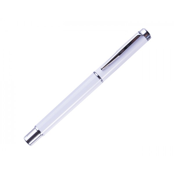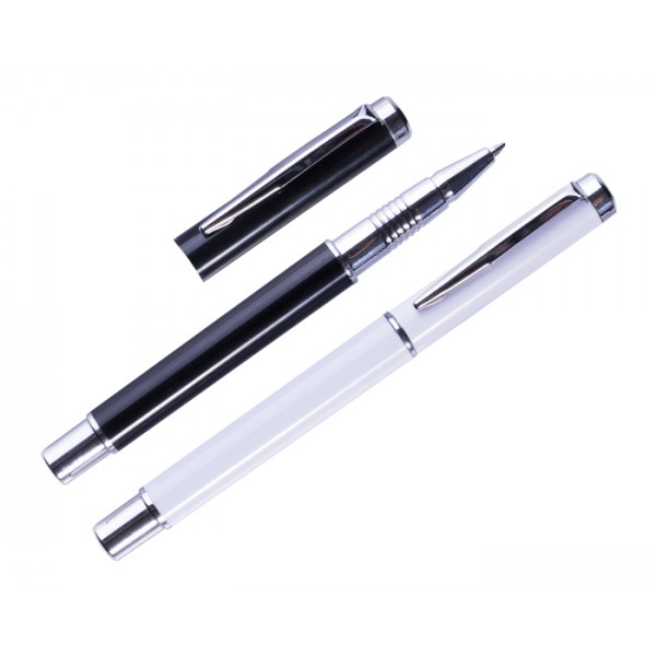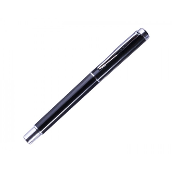Elegante bolígrafo con tinta de gel en color negro, con cuerpo y tapa en Plástico. Clip métálico.
