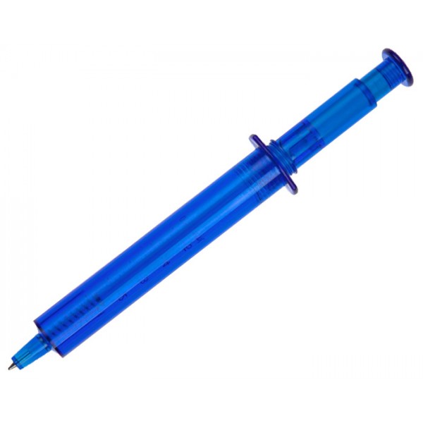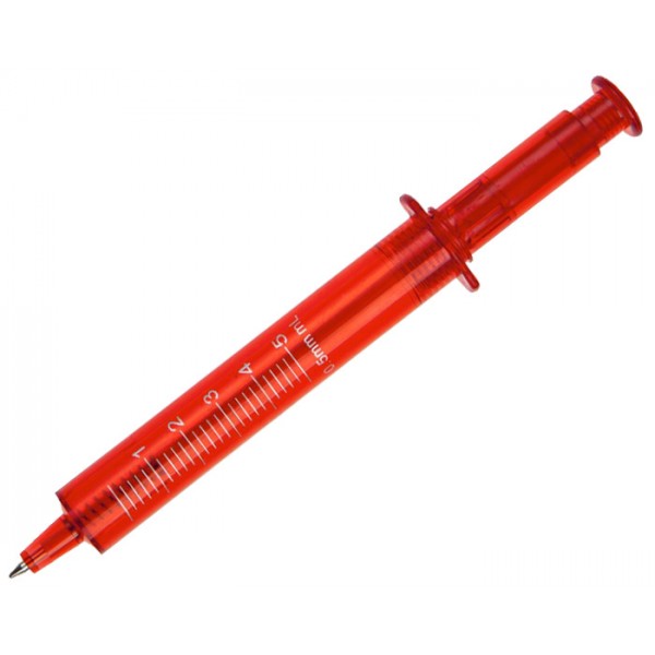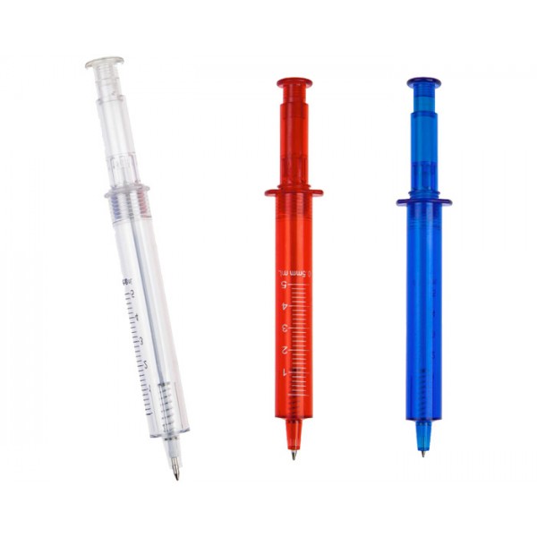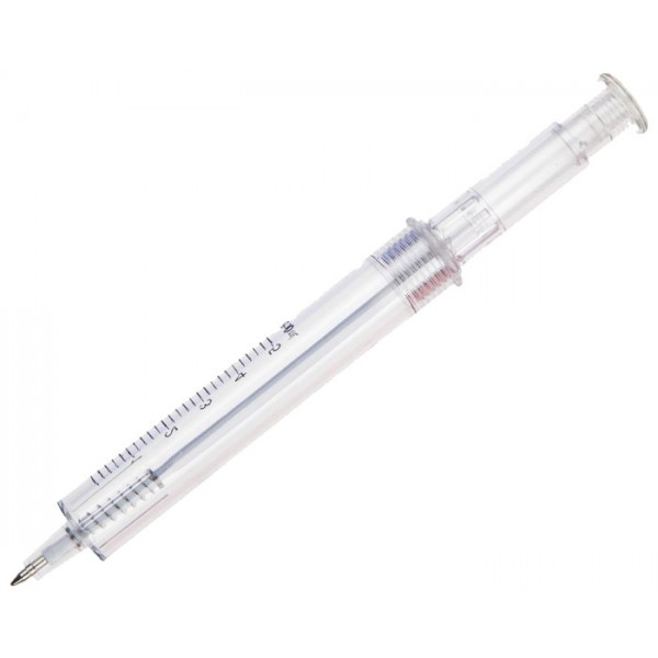 Bolígrafo en forma de jeringa con cuerpo translúcido, mecanismo de click.