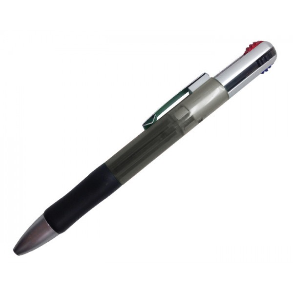 Boligrafo de plástico 4 tintas en 1: Roja, Azul, Verde y Negra, con clip metático. Mecanismo deslizante.