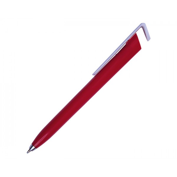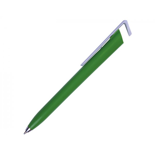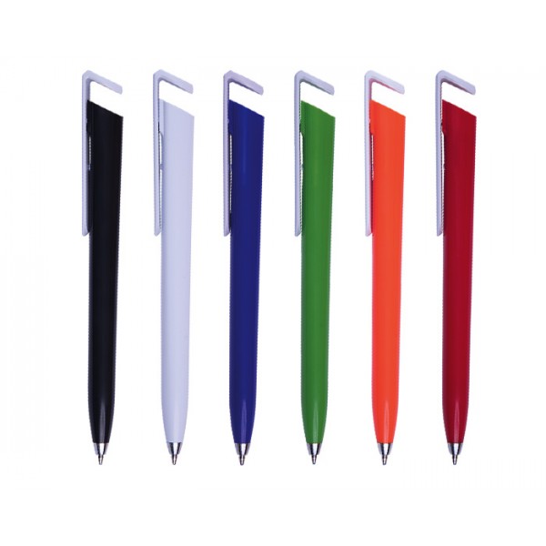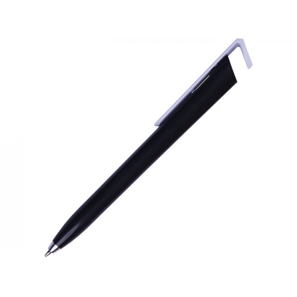 Bolígrafo de plástico a color con forma triangular. Clip en color blanco. Tapón diseñado para utilizarse como base para teléfono móvil. Mecanismo de click.