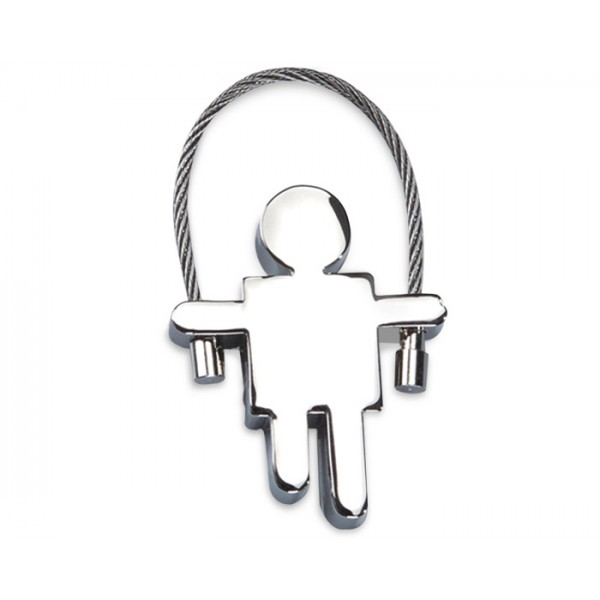 Llavero metálico, figura de niño, con cadena trenzada y perilla enroscable.