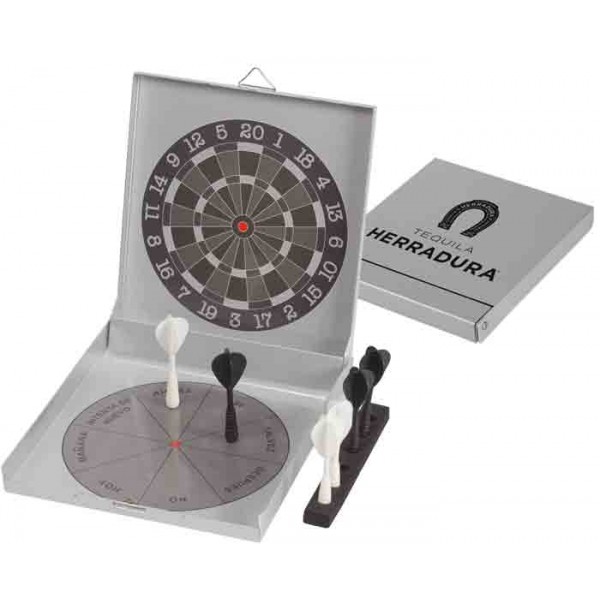Estuche cuadrado con ganchillo para colgar a pared y diana impresa en el interior para tiro de mini dardos y rueda de decisiones en la parte inferior, los dardos son de plástico con imán en la punta que hace que se adhieran a la superficie de aluminio. Incluye 3 dardos negros y 3 dardos blancos. Medida de dardo: 5.2 cm. Empaque caja individual.