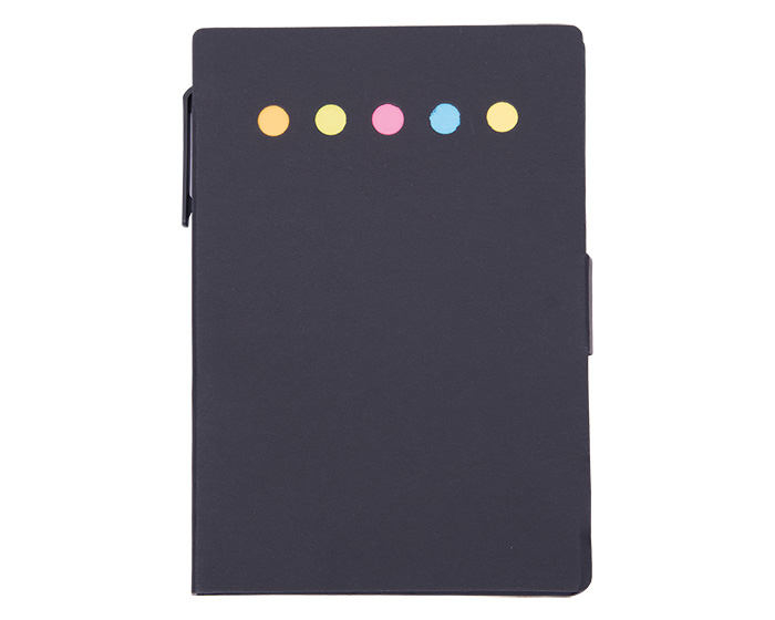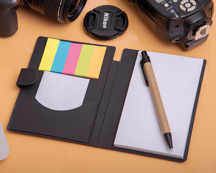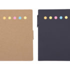 Estuche de papel reciclado con block de hojas blancas y banderas adhesivas, incluye bolígrafo de papel reciclado.