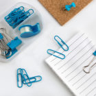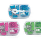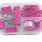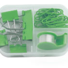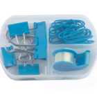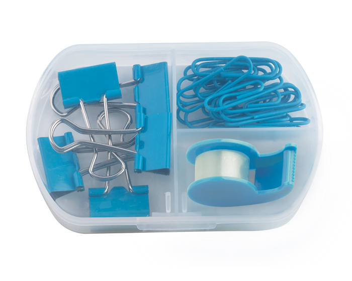 Set de papelería que incluye mini despachador de cinta adhesiva, 5 clips sujeta documentos y 20 clips para papel. Presentación: estuche de plástico transparente