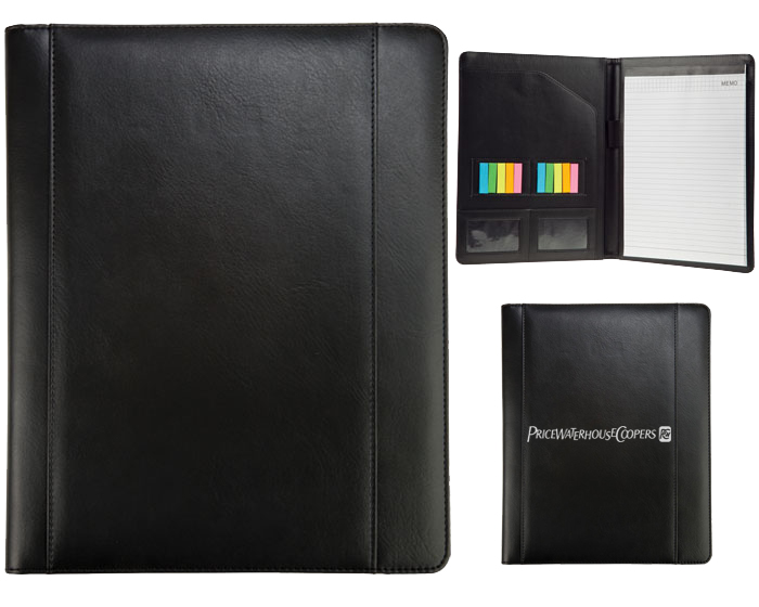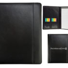 Carpeta ejecutiva con block tamaño carta con post-it, guardapapeles, portatarjetas y portapluma. Color negro.