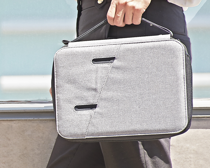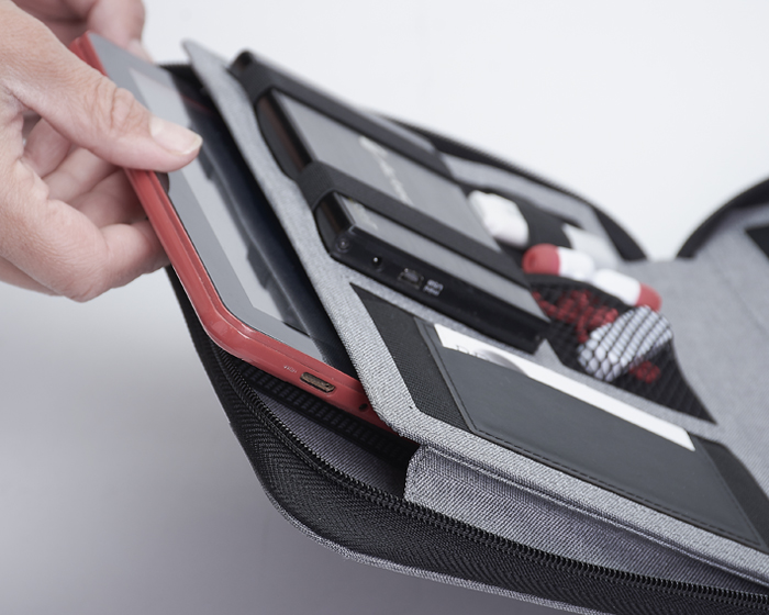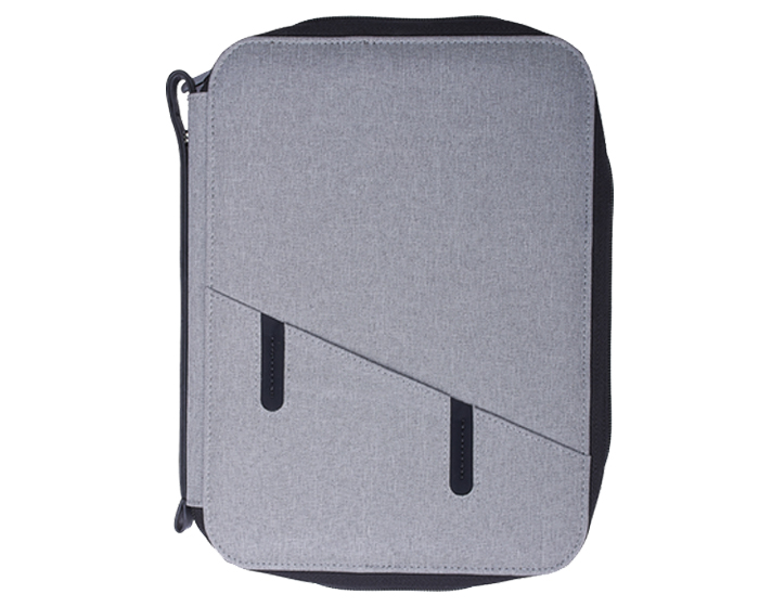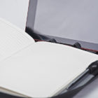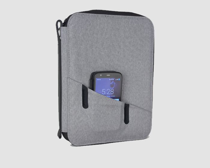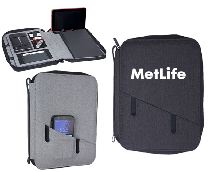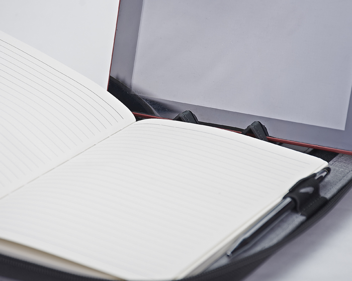 Moderna carpeta multiusos con cierre, con exterior e interior en tela. Incluye libreta tamaño A5 de 64 hojas rayadas (128 páginas). Cuenta con funda al frente para Smartphone, compartimento interior para tablet, 2 soportes ajustables portatablet o portacelular, cinta elástica para Smartphone y cinta elástica para memorias USB u otros accesorios, compartimento con ventana plástica para credenciales, divisiones para tarjetas, bolsa de malla, agarradera exterior con broche de presión, así como cinta elástica p