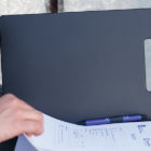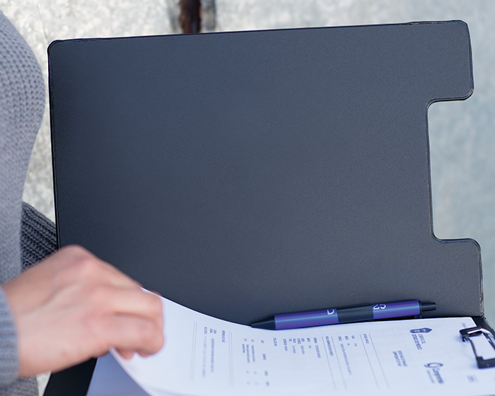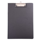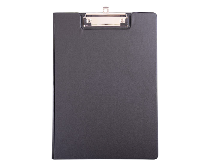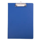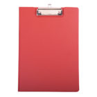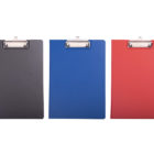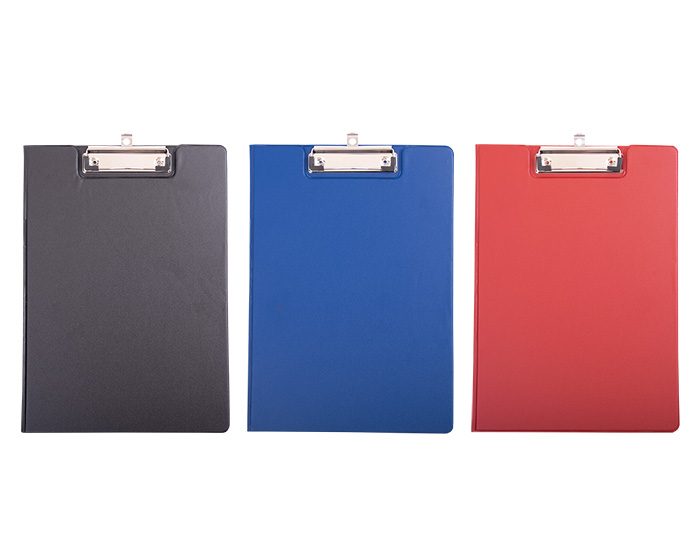 Carpeta de plástico a color con clip metálico para sujetar documentos y porta bolígrafos interior.