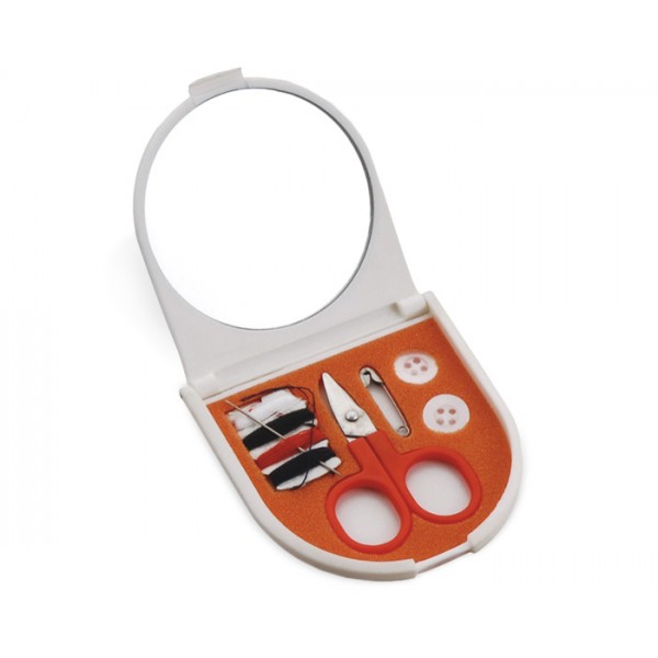 Espejo con costurero. Incluye: botones, seguro, agujas, tijeras e hilo