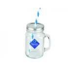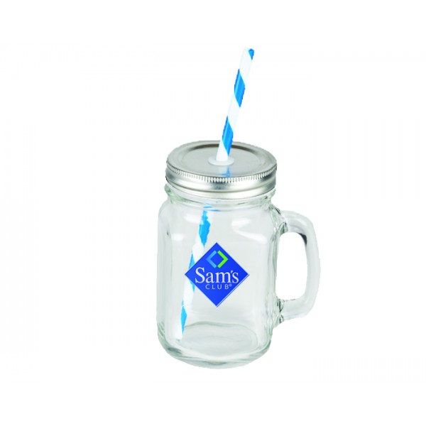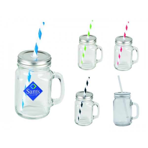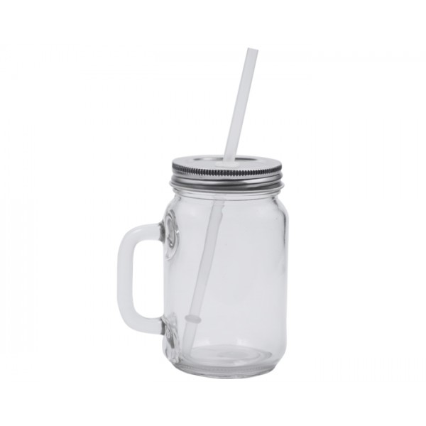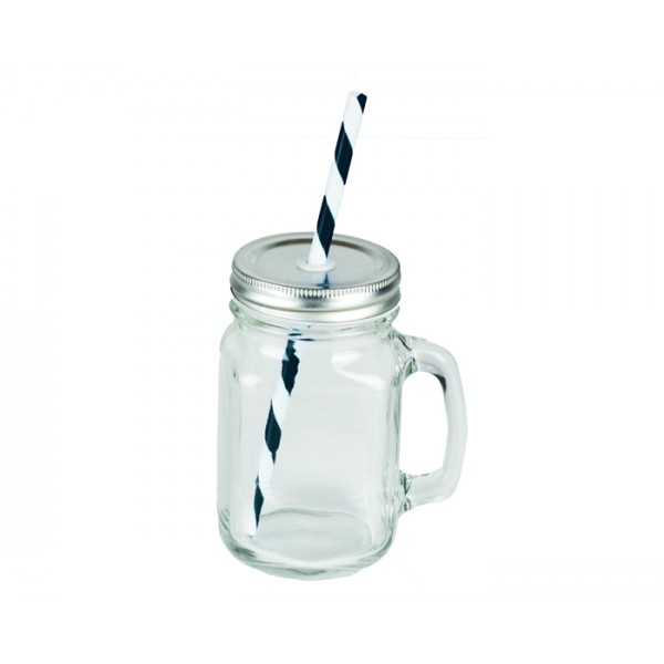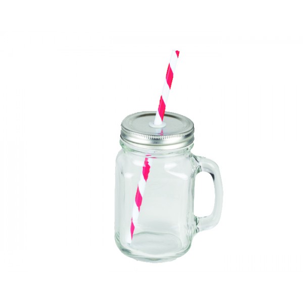 Práctico vaso de vidrio con asa y tapa de metal. Incluye popote de color para su elección. CAP. 450 ml.