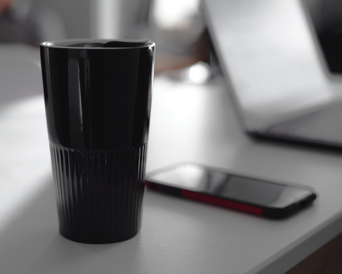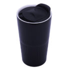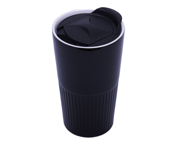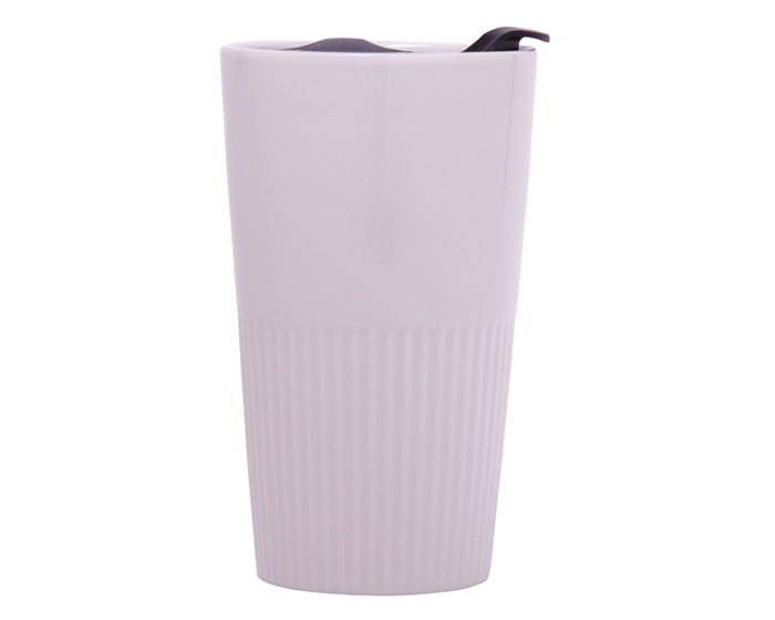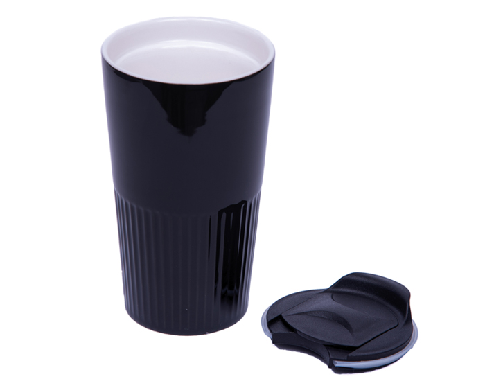 Vaso de cerámica de doble pared con recubrimiento brillante. Tapa de presión con seguro deslizable. CAP. 300 ml. Presentación: caja en color blanco