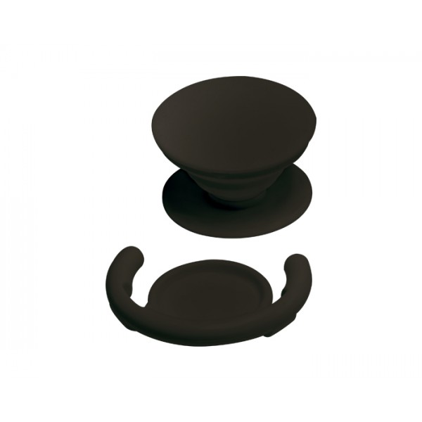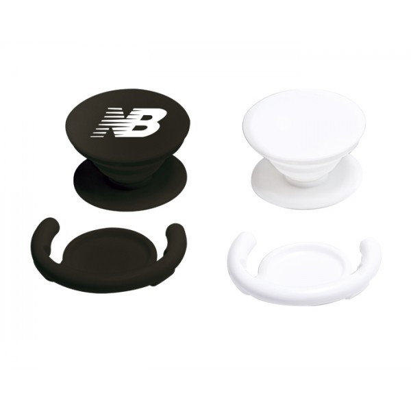 Sujetador plegable con porta celular ajustable. Se adhiere firmemente a superficies lisas y permite sujetar el celular en el tablero del auto, el cajón del escritorio y en superficies verticales planas.