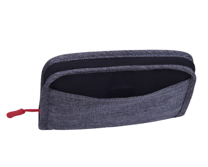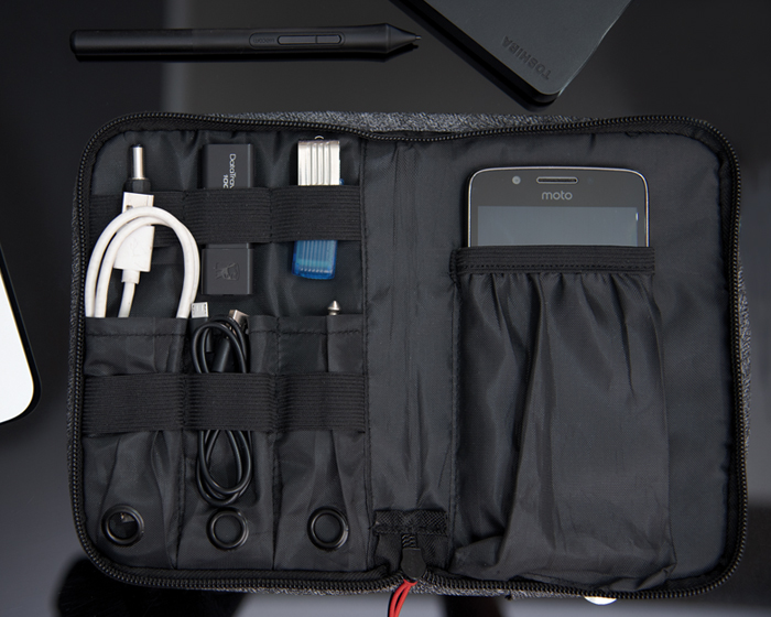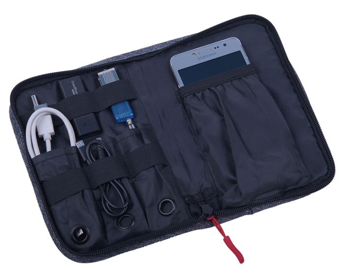 Estuche organizador para accesorios tecnológicos cuenta con tres compartimentos, bolsillo exterior con cierre, bandas elásticas para sujetar objetos. Un compartimento para power bank. (El cierre se vende por separado del color de su elección.)