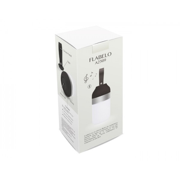 Bocina bluetooth y lámpara. Resistente al agua, para uso en interiores y exteriores. Cuenta con controles de audio, entrada para cable de carga y correa de silicón para transportar. Incluye cable de carga. Al mantener sostenido el botón de la iluminación cambia la intensidad de la luz. Tiempo de reproducción: 10 hrs. Tiempo para uso de lámpara: 6 hrs. Presentación: caja de regalo a color.
