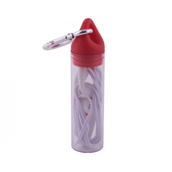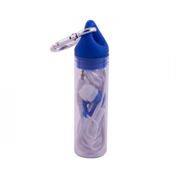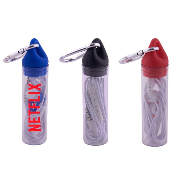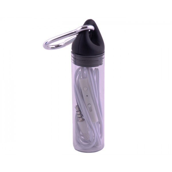 Audífonos manos libres con auriculares intrauditivos de alta definición. Presentación en estuche de plástico transparente en forma cilíndrica, con tapón en color y gancho tipo arnés para una mejor portabilidad. Extensión total: 122 cm.
