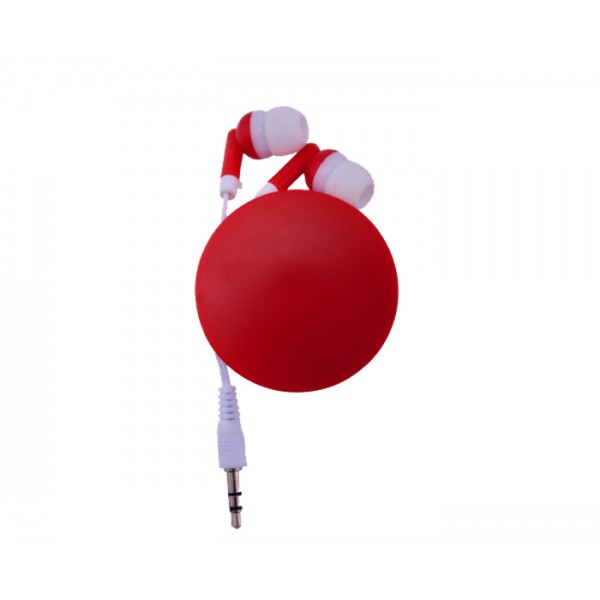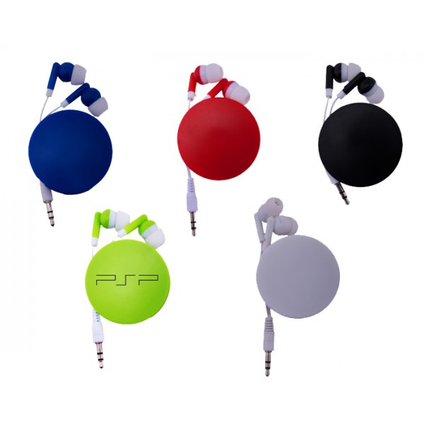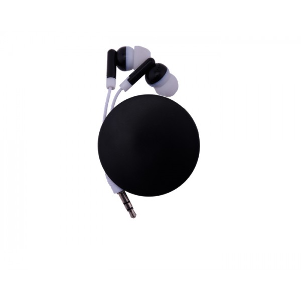 Audífonos personales con base circular diseñada para guardar los cables sin que se enreden. La base cuenta con clip para sostenerse en el cinturón o mochila. Para guardarse, se sujeta un extremo en la hendidura del reverso de la base y se enrollan los cables. Extensión total: 122 cm.