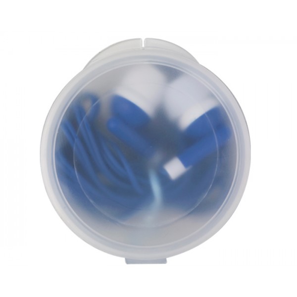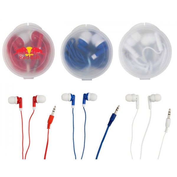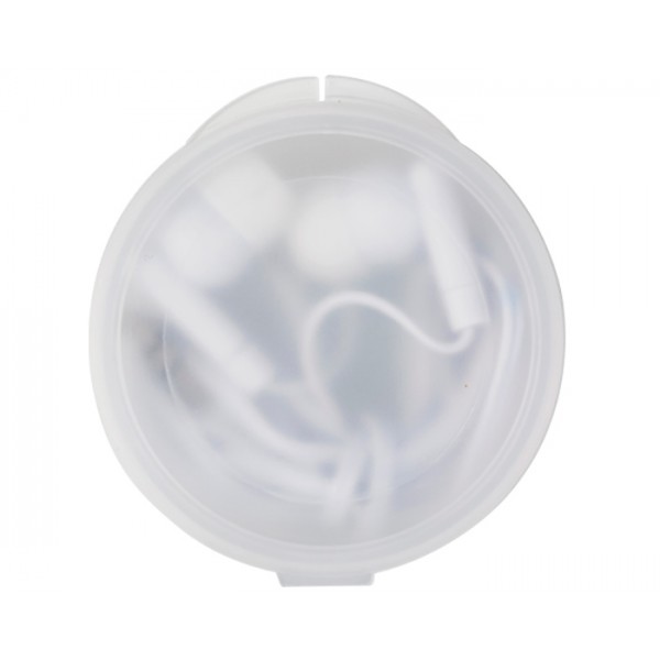 Audífonos personales con estuche redondo de plástico transparente. Extensión total 117 cm.