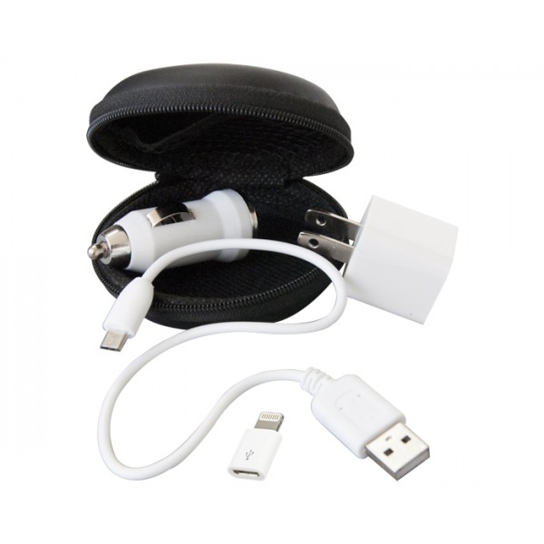 Set de 2 cargadores para celulares, tablets y reproductores, cargador corriente directa de 5v-1 amperes, cargador corriente alterna de 5v-1 amperes, incluye cable USB a Micro USB de 30 cm, estuche de silicón para resguardo y adaptador Micro USB a Lighting (8 Pines).