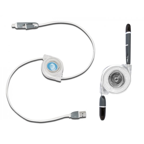 Cable retráctil para carga y transmisión de datos, para dispositivos iPhone y Android. Presentación: caja en color blanco.